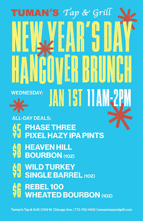 Come let me help you get back on that horse! Tumans will be open earlier that day around 11am. Alex will be your brunch bartender. Then I come in around 4 to close down the bar.