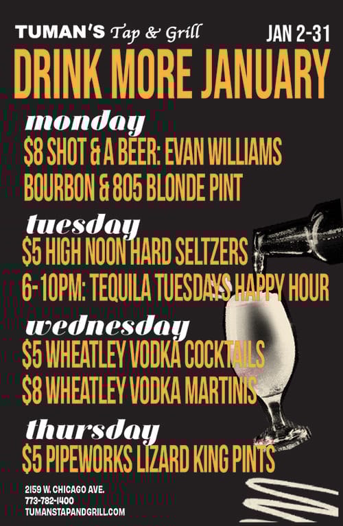 January 13th Tuesday Tumans Tap 4pm-12am