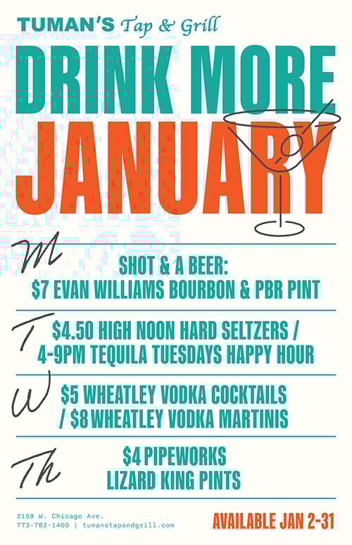 January 20th Monday Tumans Tap 4pm-12am
